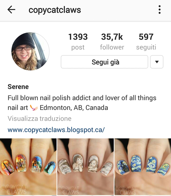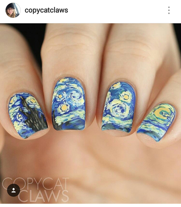 Amate le unghie corte e naturali e decorate con piccole opere d’arte dipinte a mano libera? La nail artist che fa per voi è Serene di Copycat Claws: le sue nail art sono dei piccoli capolavori di pittura con un tocco particolarmente artistico e delicato. Instagram: @copycatclaws